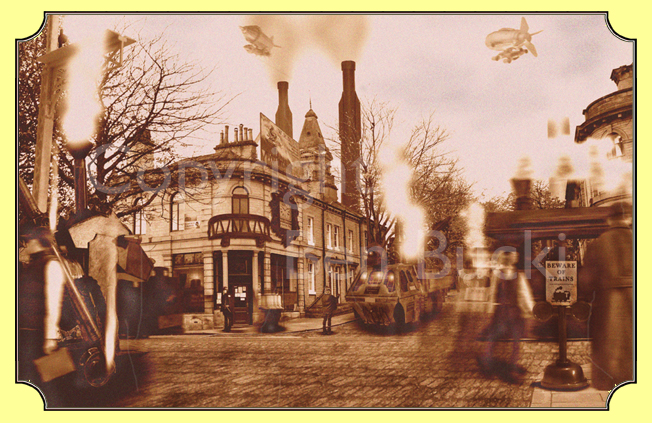 Digital Composite Image-Victoria Road, Saltaire, with various miniature sculptural elements and portraiture shots.
